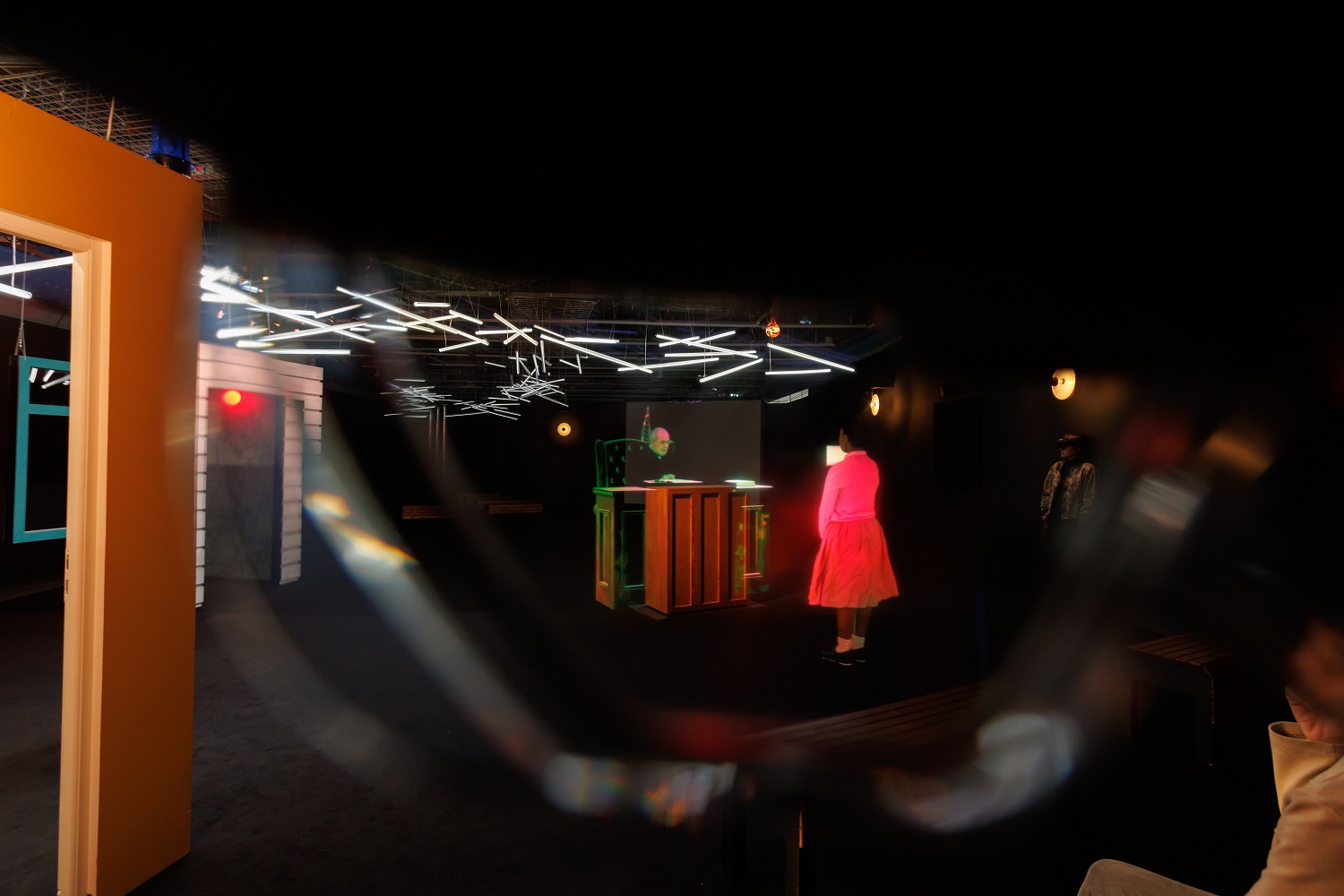 《黑》這部沉浸式AR在不同場地呈現時,也會因地制宜做些許調整,例如在巴黎龐畢度中心首演時,除了在現場佈置上門窗,另增加講台、公車拉霸⋯⋯隨著劇情場景需求,現場實物皆可利用AR光影轉變成另一種樣貌。這一點與VR建構完全的虛擬場景有著極大差異。