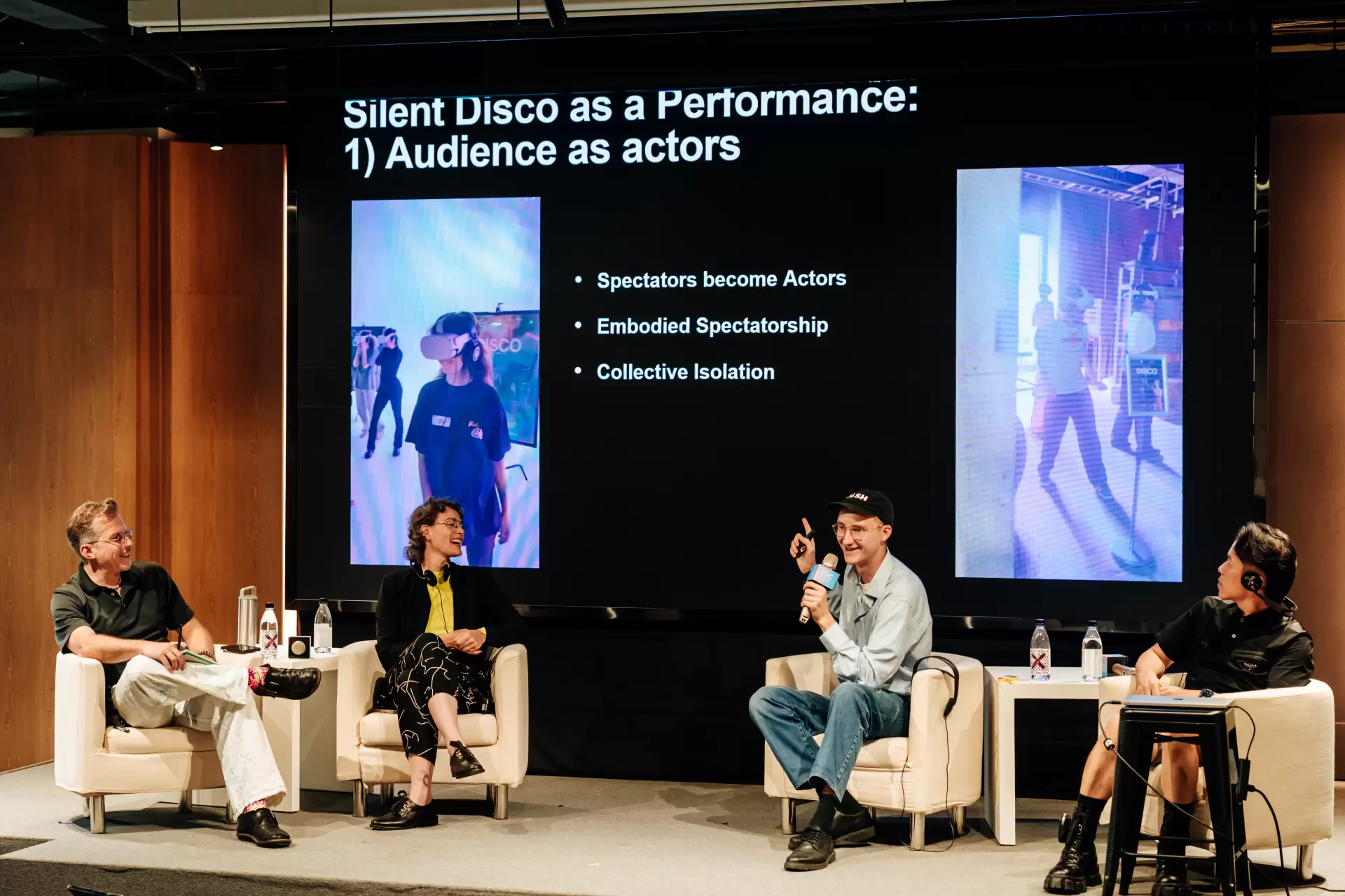 Fabio也有相同的感受,他覺得觀賞XR作品就像是一種邀請,能讓觀眾成為表演的一部分。對他來說,XR是一種儀式,觀眾在穿戴裝置,閱讀使用須知時,就像是準備跨越到另一個時空中。他期待觀眾在觀看《默日迪斯可》時,能隨著音樂起舞,逐漸沉浸到狂喜派對當中。觀眾同時是旁觀者,也在現實空間成為另一個表演者。