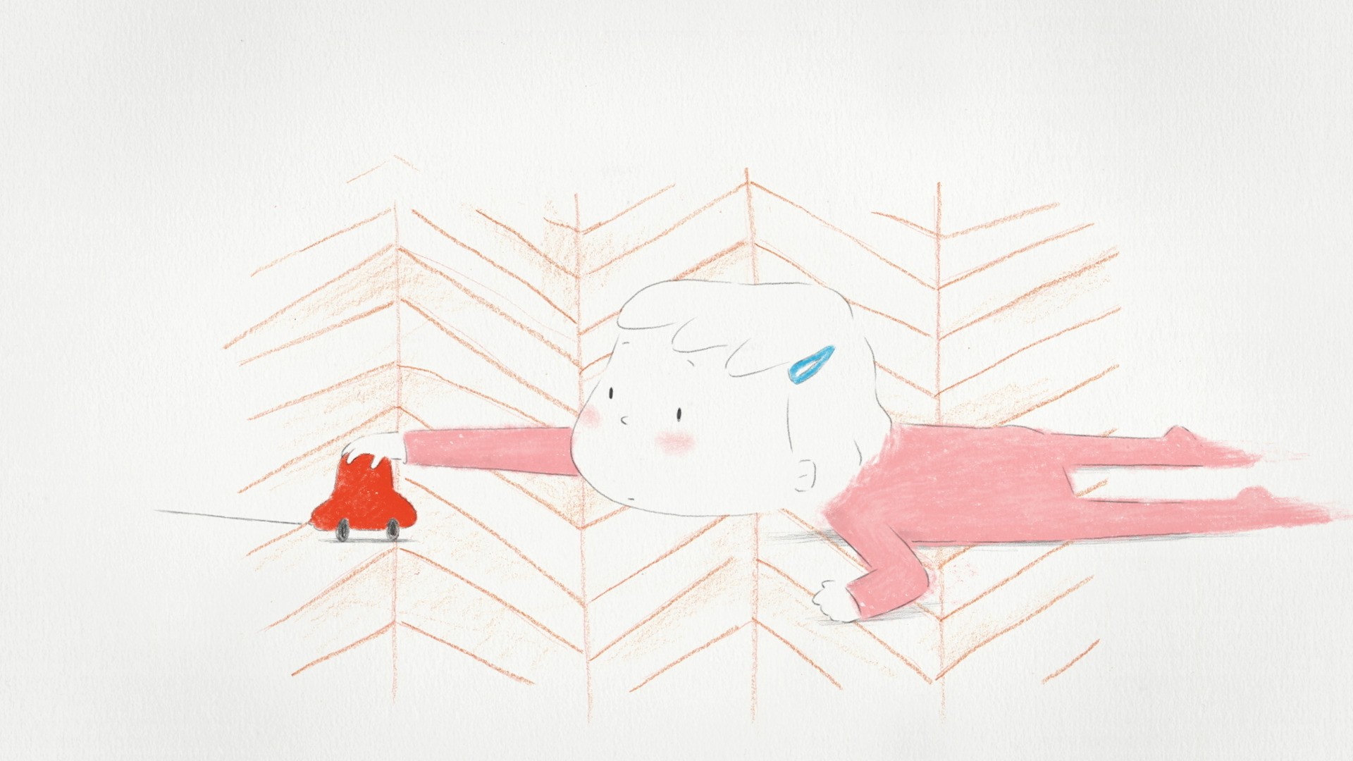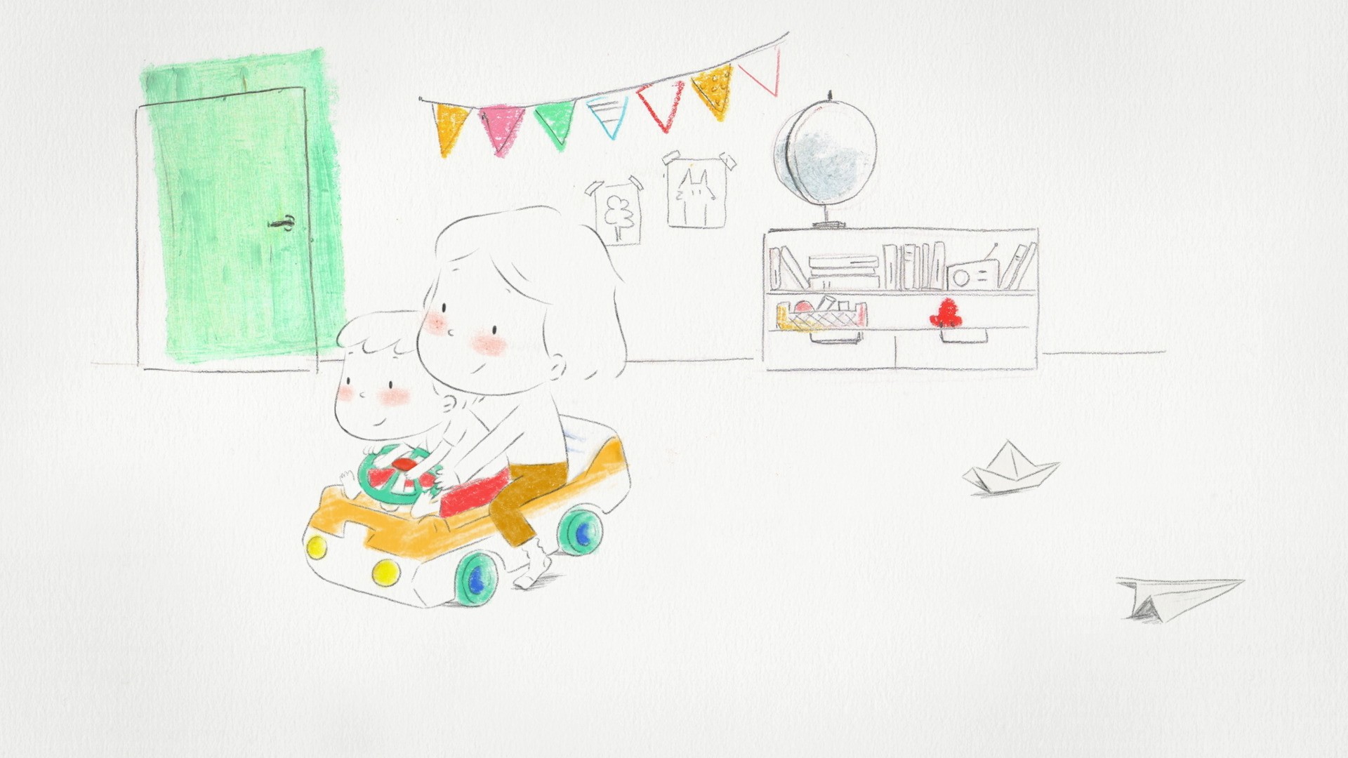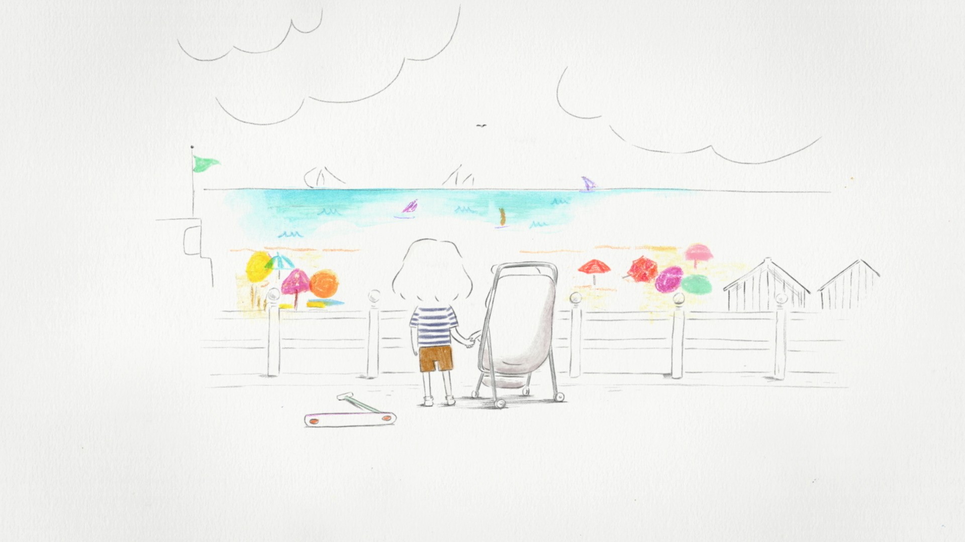 從嬰兒車到牙牙學語,再從學步車到代步輪椅,姊姊帶領著妹妹前行、妹妹也牽著姊姊的手,倆人充滿歡聲笑語,共度美好時光。流暢的線條像流逝的時間,當彼此的好姊妹,在成長的過程相伴相依且擁有溫暖擁抱,一起看見更寬廣的世界。
