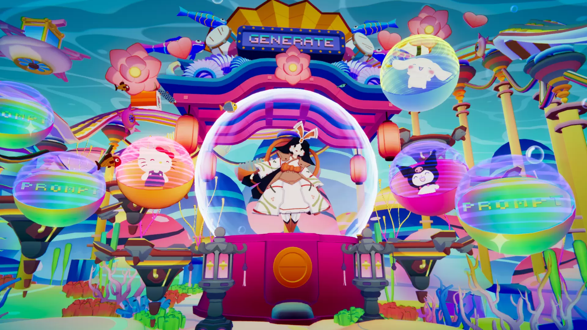 在機器龜的引領下,Kitty、大耳狗喜拿與酷洛米一同來到神秘的AI龍宮城。 這裡是AI乙姬所居之地,一切皆可隨心所欲地生成與創造…… 在這個奇幻異境中,你將會創造出什麼樣的未來?