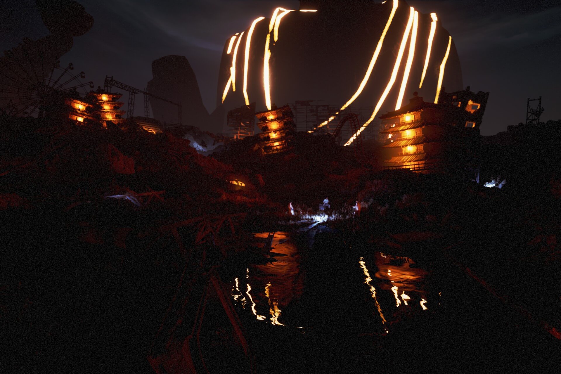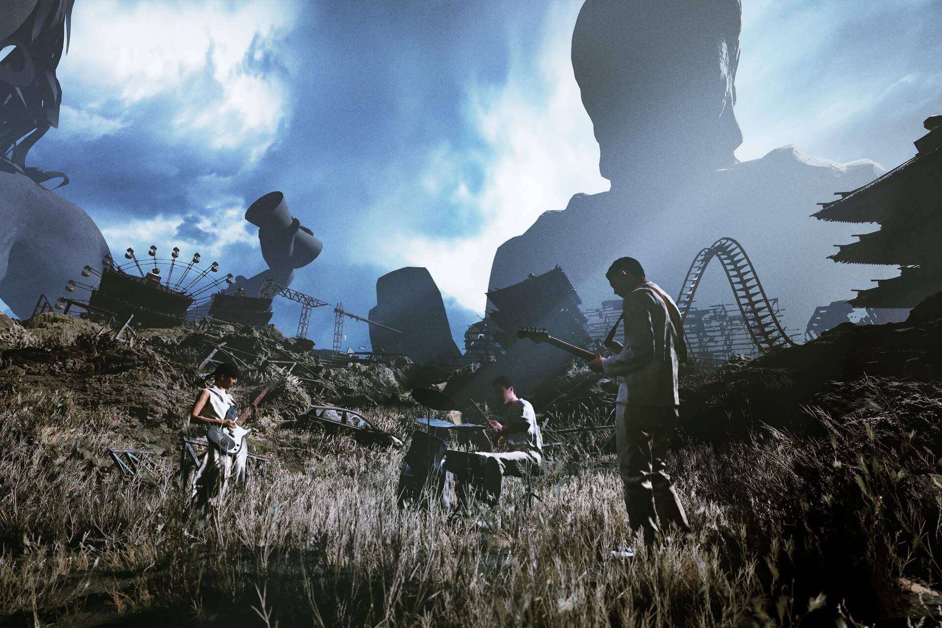 以召喚神明為概念,從儀式性的大盒子出發,當九天民俗技藝團的台灣傳統器樂,碰撞上大象體操的現代樂音,我們進入了破敗的海港景緻,遠方巨大的神像如海市蜃樓般遙望著祈願的我們。當神像甦醒回應我們奏出的音樂聲響,我們向著神明的世界移動,實景開始逐漸虛化,我們也因此疑惑著曾經以為的現實是否真實。到底是我們召喚了神明,還是神明招喚著我們?