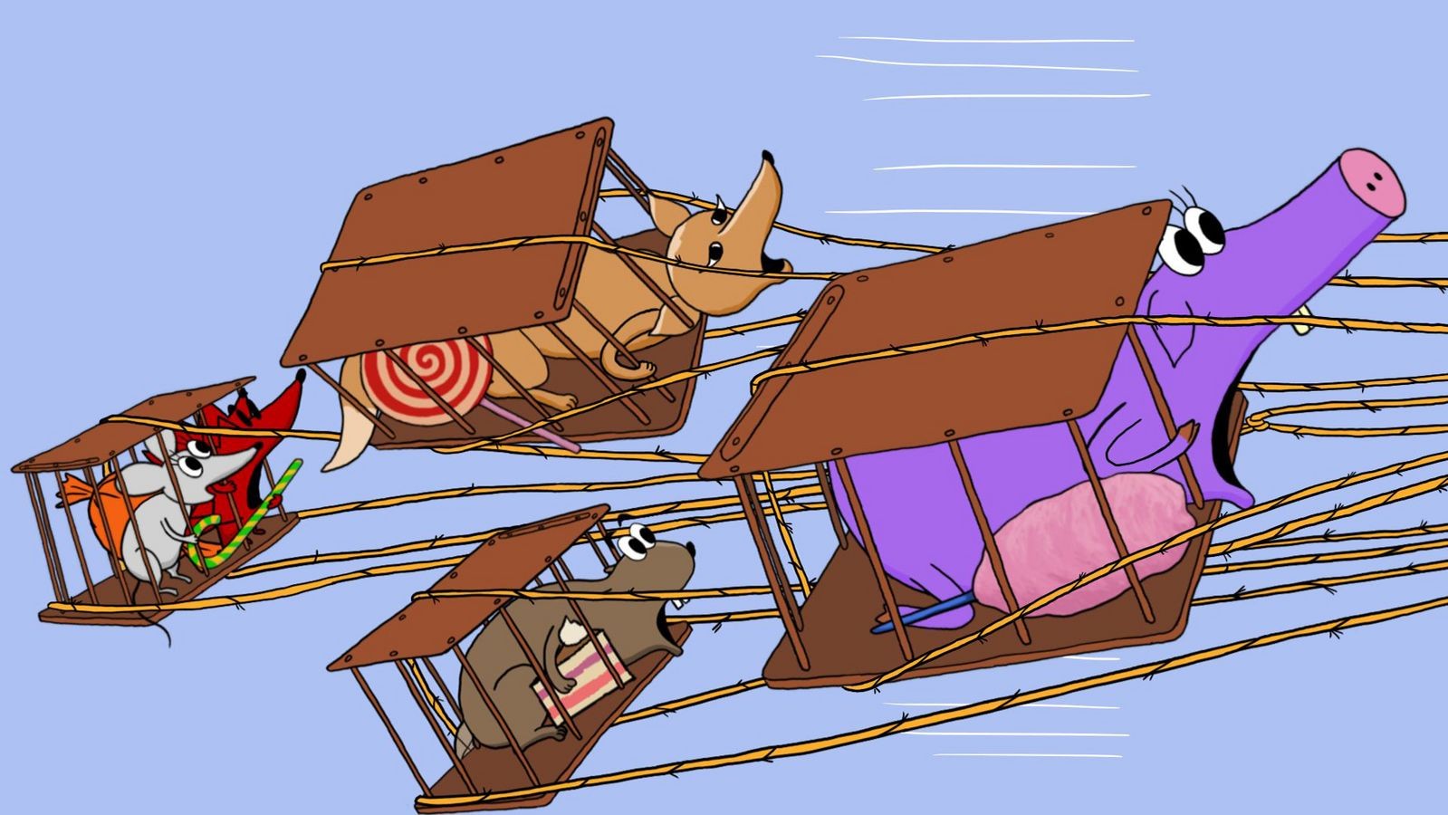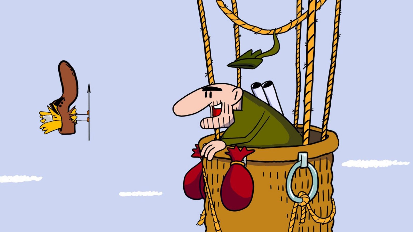 Morning breaks in the forest, and Prince Ki-Ki-Do takes his morning tea. A hunter flies by in a balloon and traps several animals. Prince Ki-Ki-Do hears their cry of despair and puts down his newspaper, and an air battle begins.